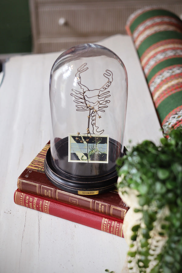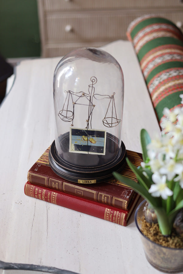 The 12 astrological signs make up the Zodiac, a word which comes from ancient Greek, the prefix “zo” meaning “set of animals.” The Zodiac is, in fact a wheel of animals symbolising the energies the livings go through during a solar year. From Earth, we can see 12-star constellations on the ecliptic. These constellations are represented by the signs of the Zodiac, which are used in Astrology (word meaning “Time Map”). This “science” enables astrologers to set up a horoscope, which is, in fact a map of destiny. Astrology is the “study of stars. It’s neither a religion, nor a belief. It’s a system which is at the same time astronomic, psychological and a forecast. Unlike many other divination techniques seen through the centuries, astrology has kept its popularity.” This collection of twelve signs has been hand-crafted by our artisans in our workshops. Each sign seems to be floating, as if levitating under its glass dome. It comes with its own star constellation, and traditional illustration. Treen, glass and steel wire