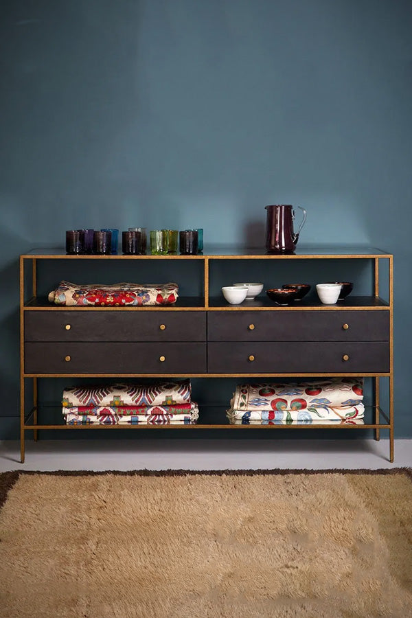 A refined console table defined by a slender Gilded Steel frame, paired with two bronze drawers and upper and lower shelves in softly aged mirror. The bronze coating is applied and worked entirely by hand, giving every piece its own subtly individual surface and tactility.