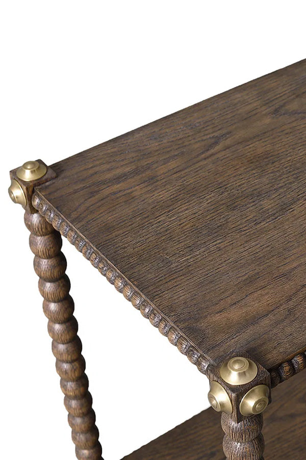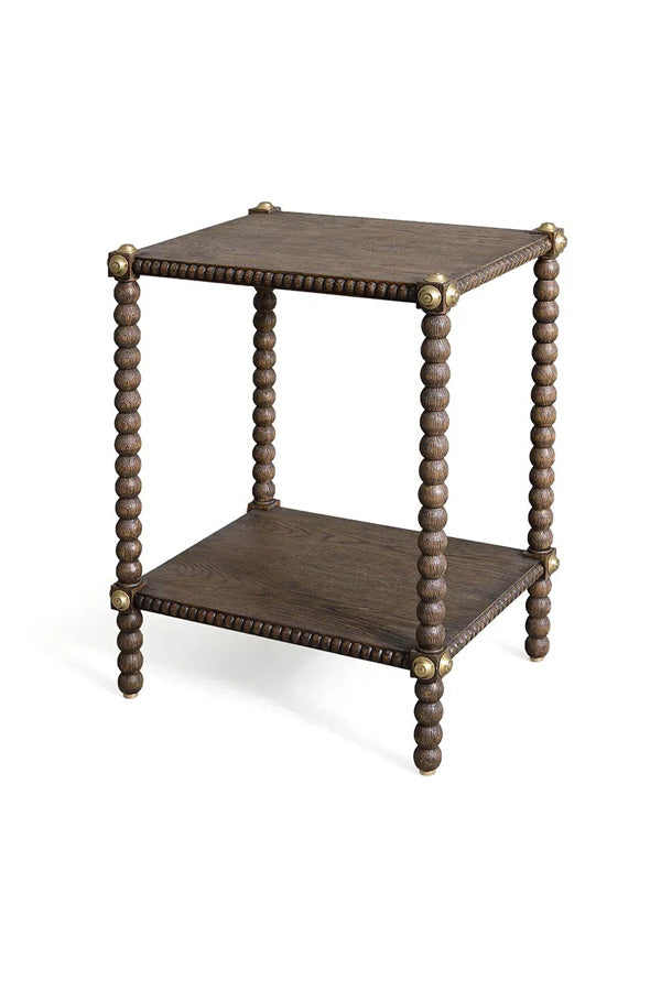 A two‑tier side table crafted in Rustic Oak, its form defined by straight bobbin legs and small aged brass discs set at each corner where the shelves meet the frame. The brass detailing is applied and worked entirely by hand, giving every piece its own distinctive surface and character.