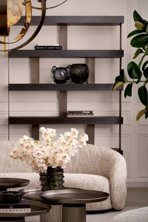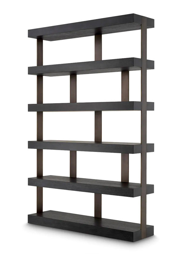 This shelving unit is clad in a smoked oak veneer with a deep charcoal finish that feels rich and textured, while the bronze uprights add just the right amount of warmth to offset the strong lines. The proportions are generous without being heavy, giving plenty of space for books, art, or curated objects.