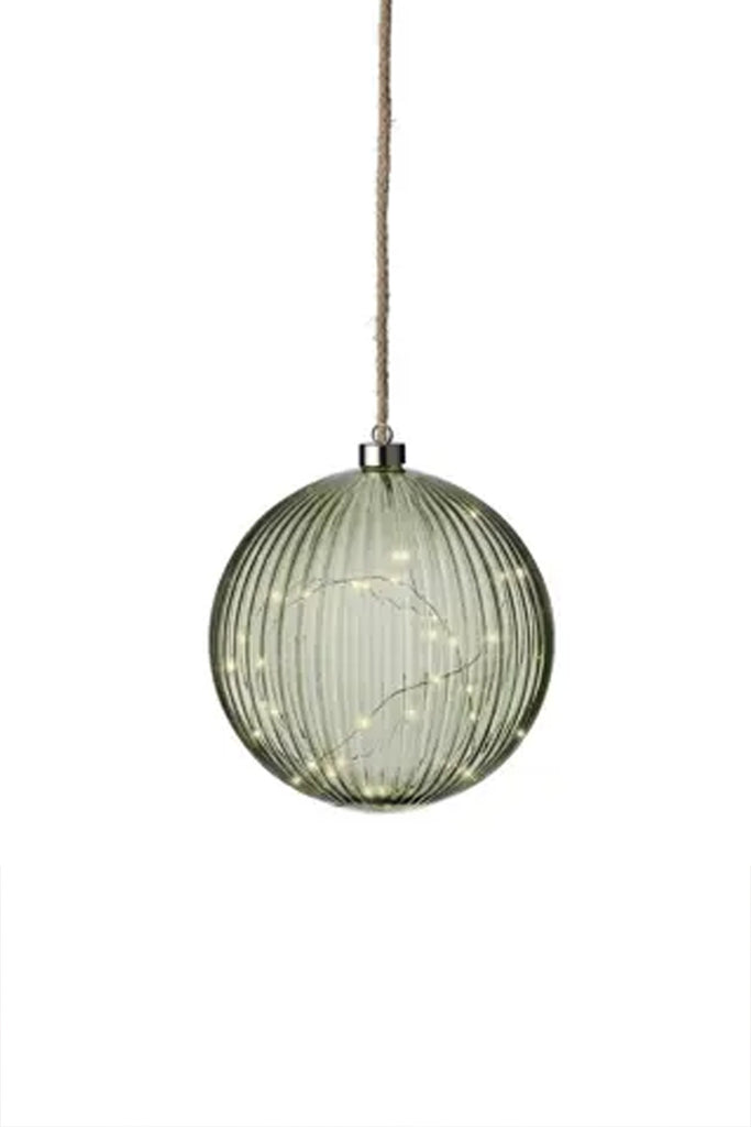 This large ribbed glass bauble houses a string of LED lights, giving off a soft, ambient glow. The gentle shimmer highlights the ribbed glass and adds twinkle to your festive scheme, whether hung on the tree or displayed as a standalone feature. Requires 2 × AAA batteries.
