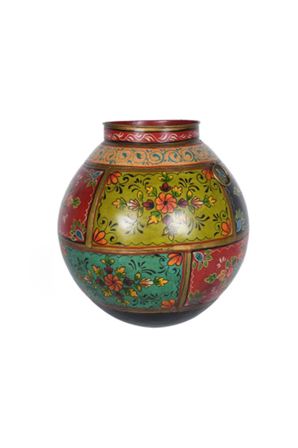 This one‑of‑a‑kind iron pot is entirely hand‑painted, its surface arranged in vivid panels of green, red, and teal that carry delicate, wonderfully intricate floral motifs. Not suitable for fresh flowers.