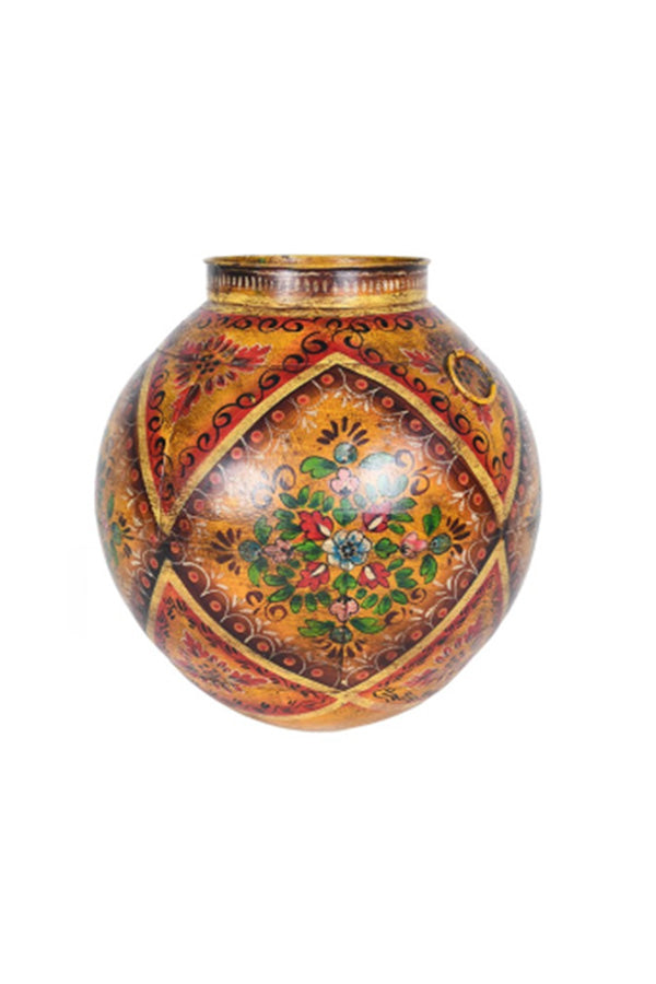 This unusual iron pot is a one‑off, hand‑painted in warm amber and gold tones that frame its finely detailed floral work.