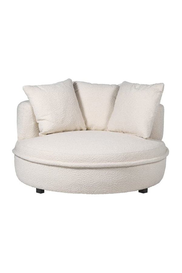 A circular loveseat upholstered in ivory bouclé, with a curved back and three loose cushions for relaxed, informal seating. The exaggerated chunky piping that runs around the seat edge gives the piece its character and definition, adding structure to the soft, rounded form. Set on small dark feet, it sits lightly in the room and works well in living spaces, bedroom corners, or dressing rooms.