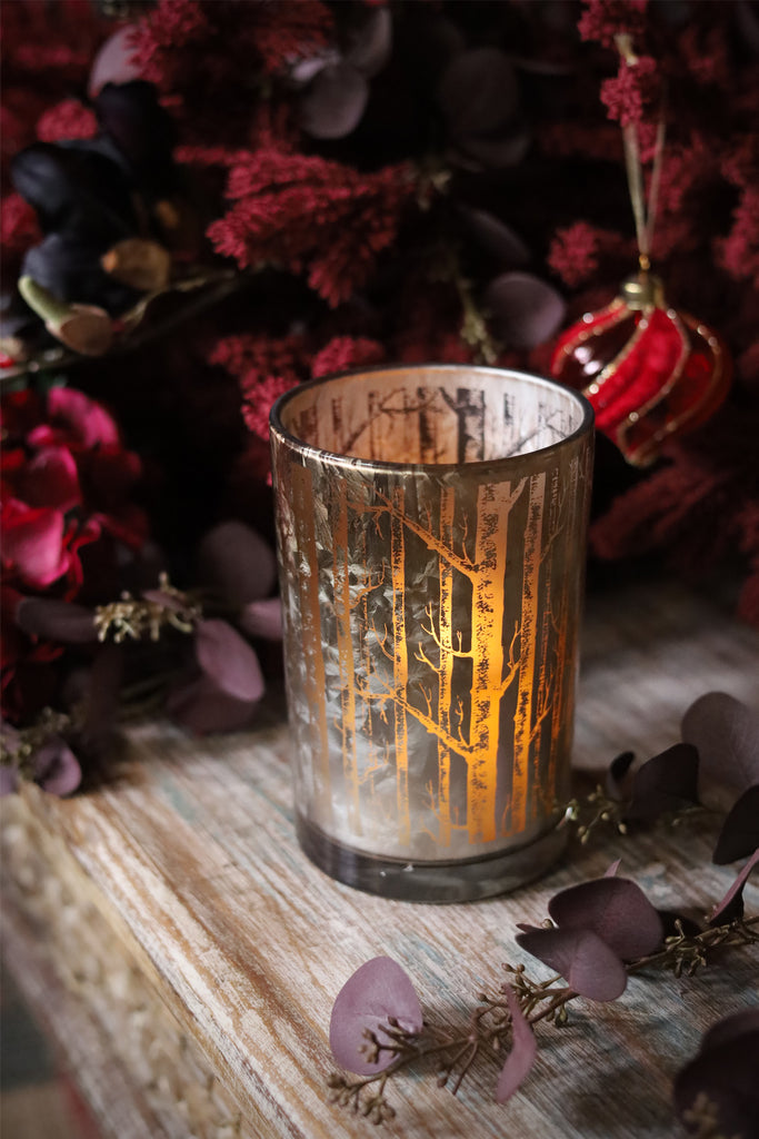 Etched with a delicate silver birch design, this glass votive brings a soft woodland shimmer to your festive scheme. The pattern glows beautifully when lit from within – whether by candle or fairy lights – creating a gentle, atmospheric flicker. Perfect for mantels, tables, or window ledges.