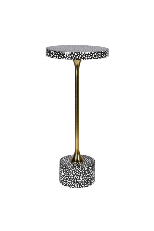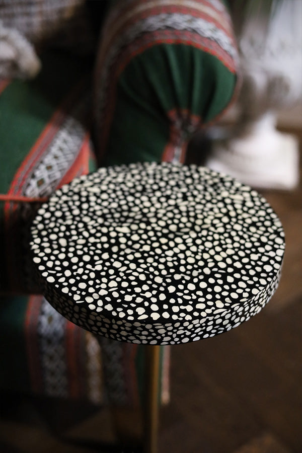 This charming spotted black and white table is ideal for tight spaces, offering a touch of character and a convenient perch for your drink. Its irregular spot pattern draws inspiration from the natural texture of shagreen, giving the surface a distinctive, organic appeal. Supported by a single brass stem with a weighted base, it remains light enough to move effortlessly wherever needed.
