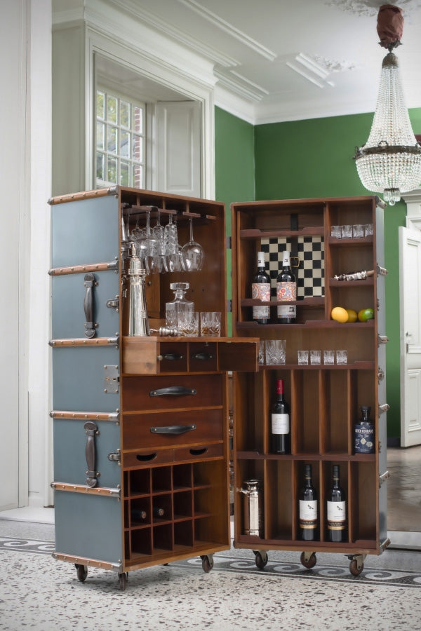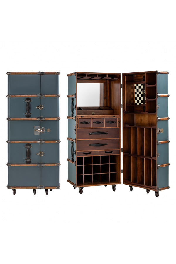 Nothing creates a sense of occasion quite like wheeling your bar into the room. Inspired by turn of the century travel trunks, this handcrafted piece is finished with solid brass hardware and bridle leather details. Inside, a two-part bar reveals a world of possibilities: drawers for essentials, twin serving trays, bottle racks for both upright and horizontal storage, a mirror, and a foldout work shelf. Remove the right-hand shelf unit to uncover a hidden game board, because leisure deserves layers.